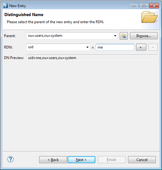 A sn and cn are needed to confom to the LDAP Schema. Add them in the assistant before trying to create it